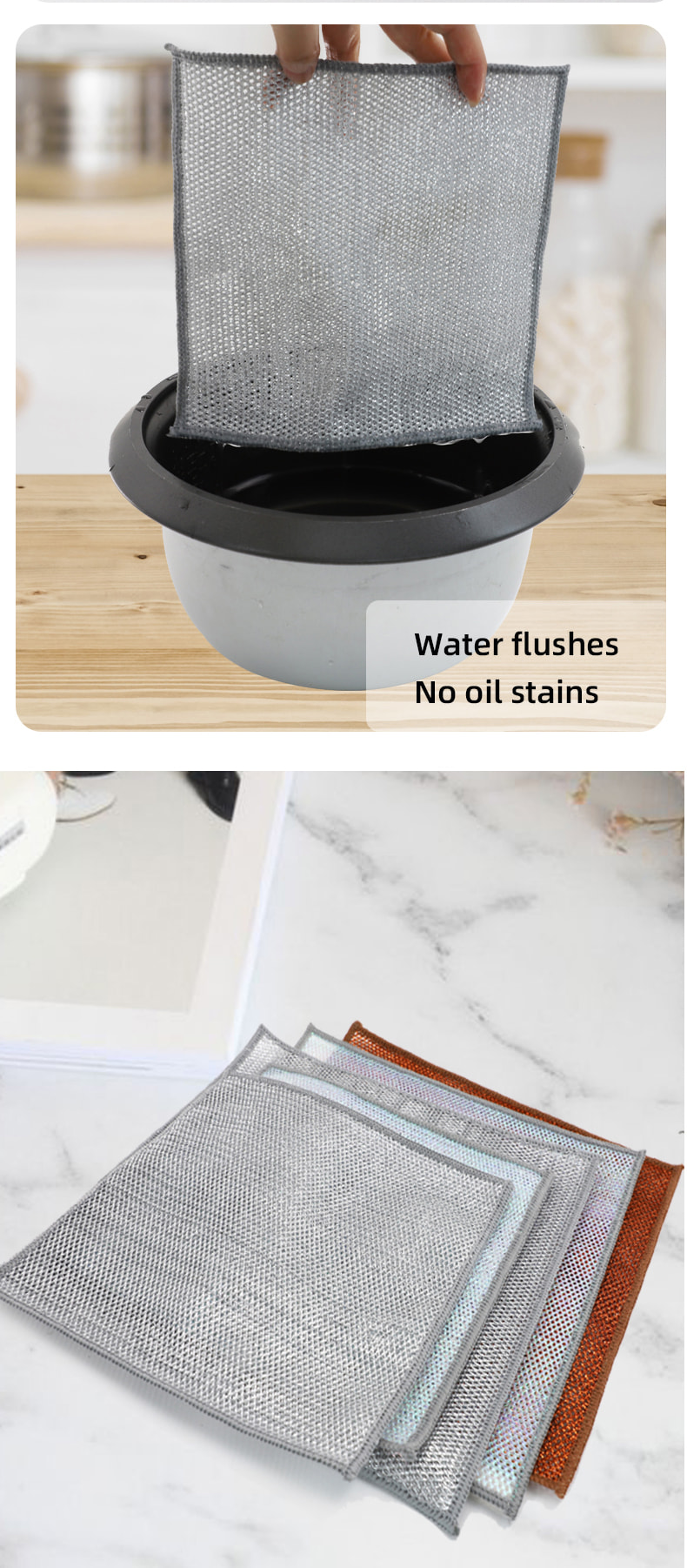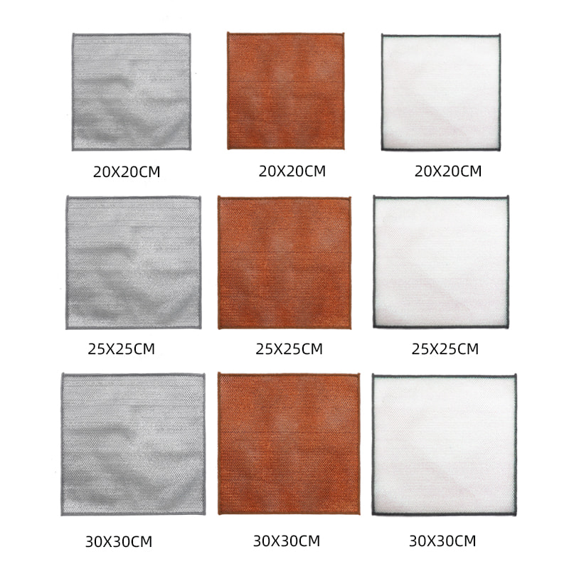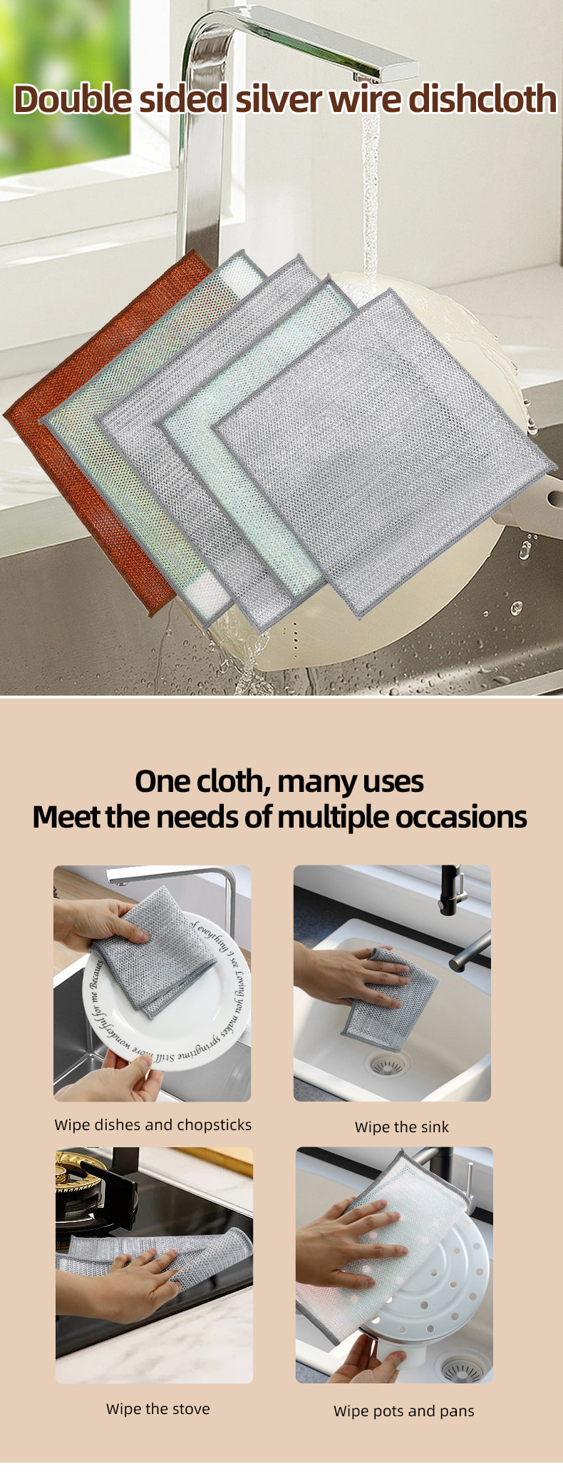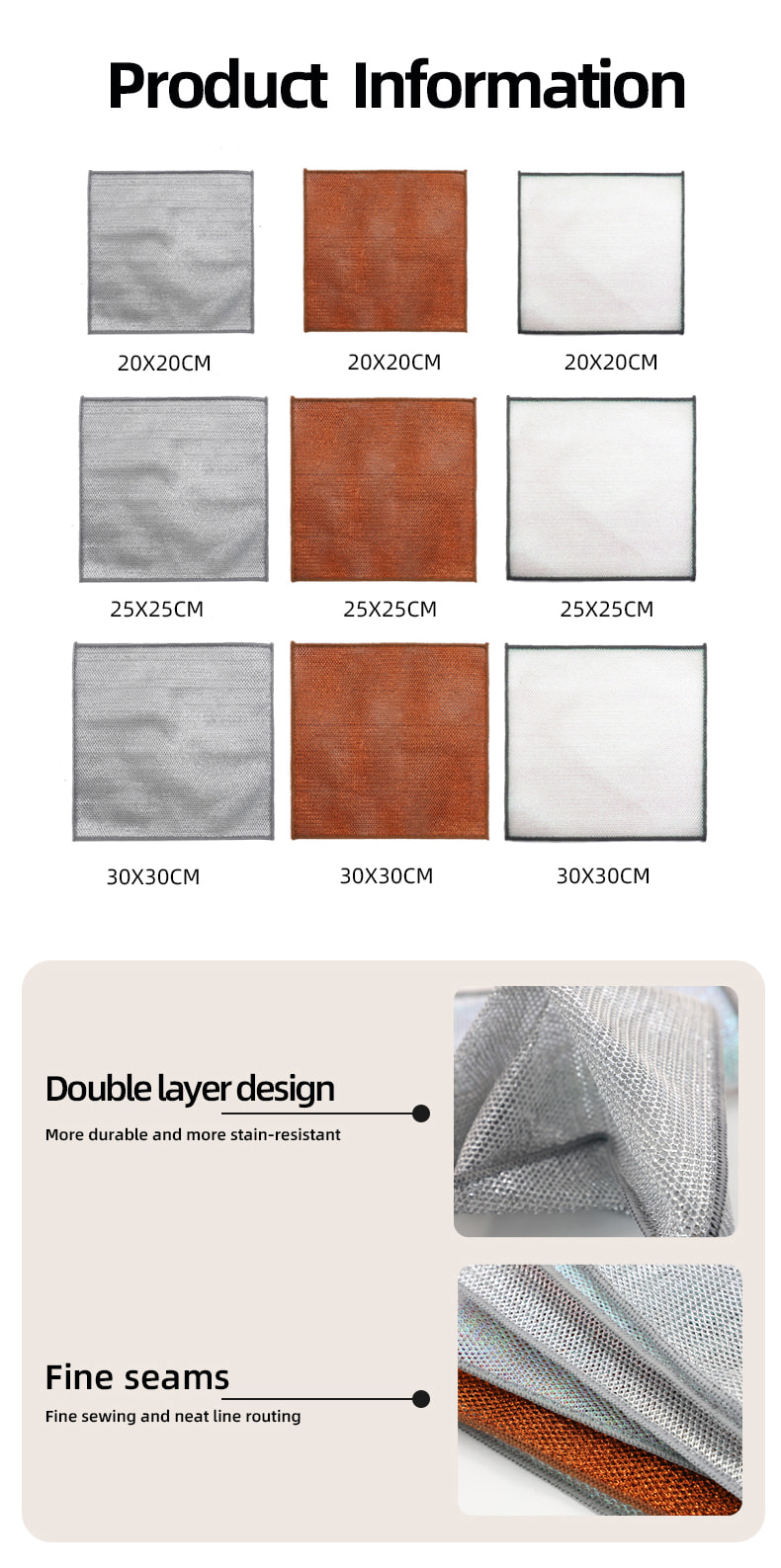 Kétoldalas ezüst drót mosogatórongy, Bronz selyemből készült, nagyon drága; Nincs bevonat, nincs por, nem fakul; Nincs olaj, nincs olaj, erős kaparás, de nem sérült az edény. Színes selyemből készült, olajos és nem ragadós, magas megjelenési értékű; Nincs bevonat, nincs porcsepp, nem fakul el a szín; Erős kaparás, de nem sérült az edény.