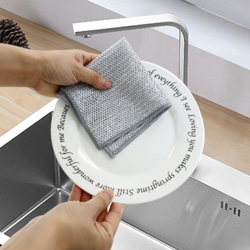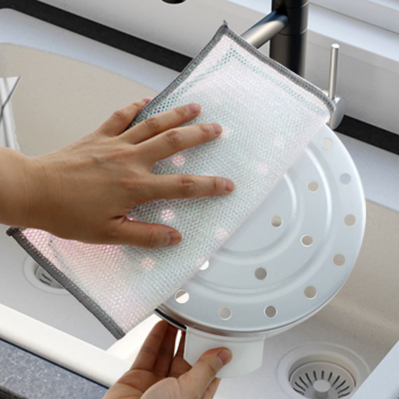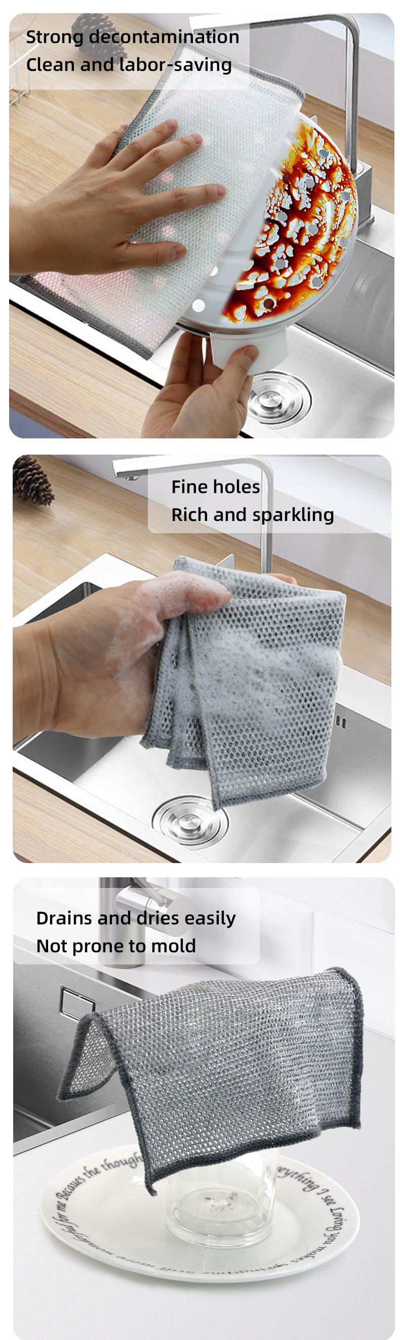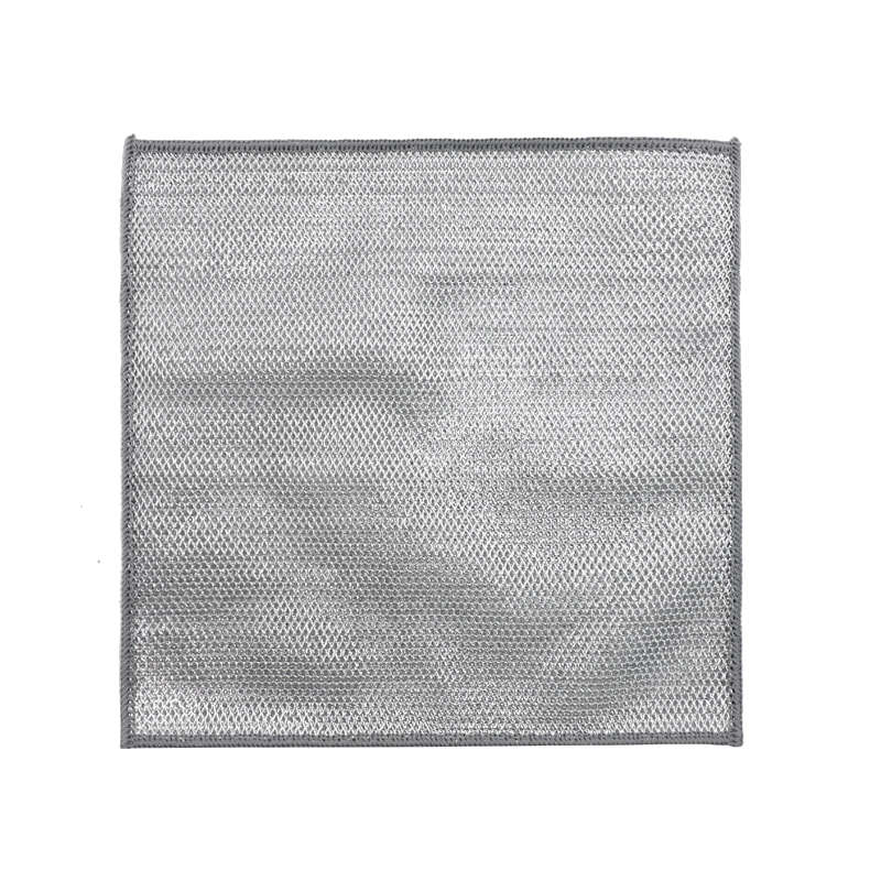 Kétoldalas ezüst drót mosogatórongy, Bronz selyemből készült, nagyon drága; Nincs bevonat, nincs por, nem fakul; Nincs olaj, nincs olaj, erős kaparás, de nem sérült az edény. Színes selyemből készült, olajos és nem ragadós, magas megjelenési értékű; Nincs bevonat, nincs porcsepp, nem fakul el a szín; Erős kaparás, de nem sérült az edény.