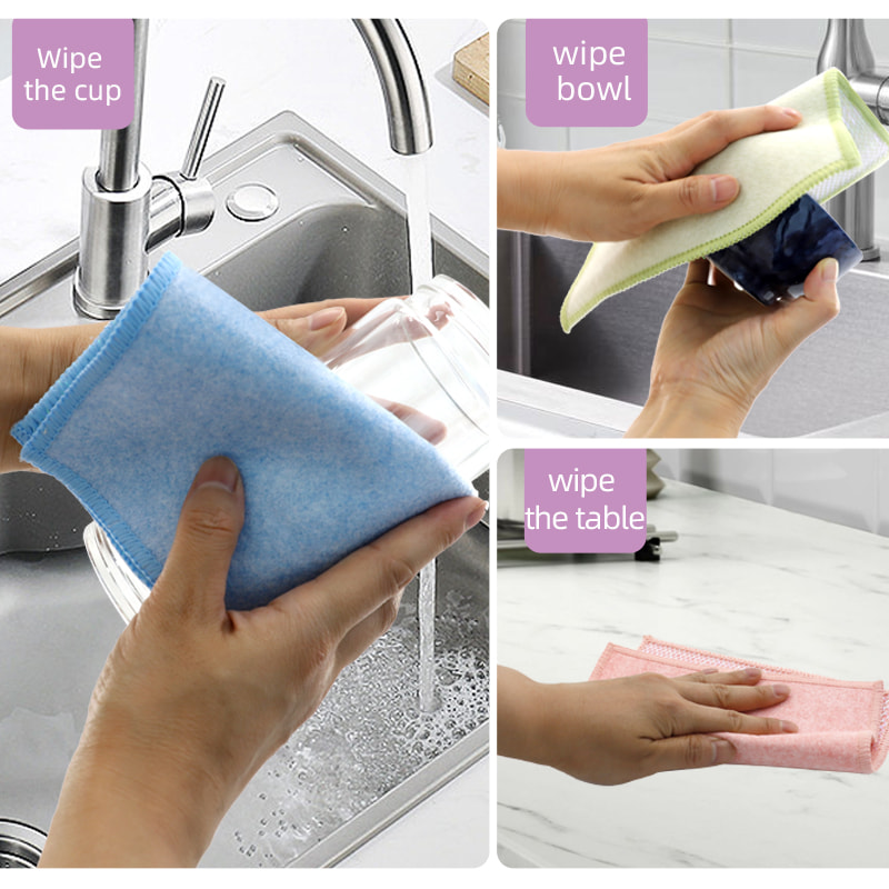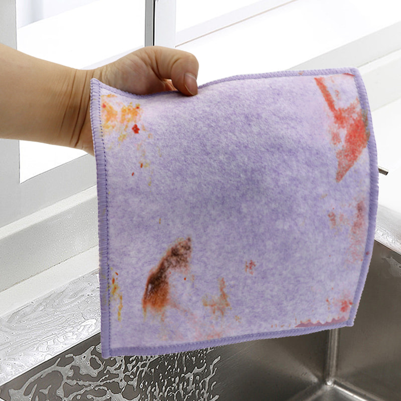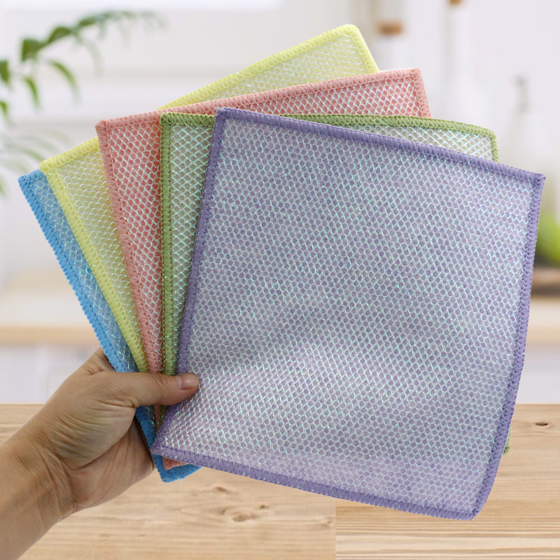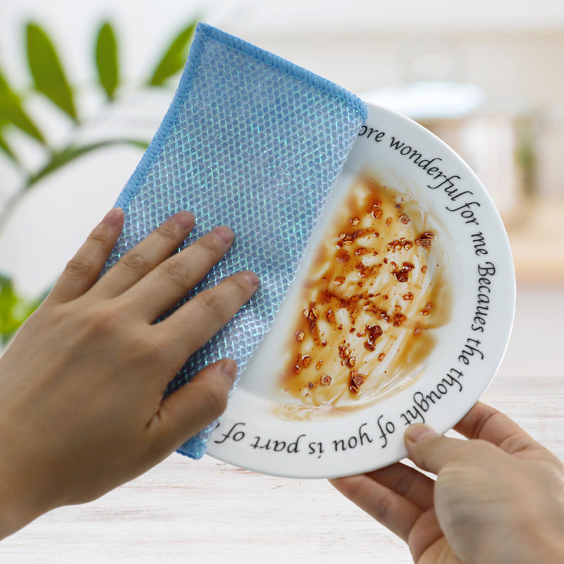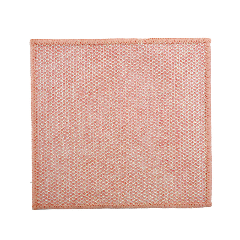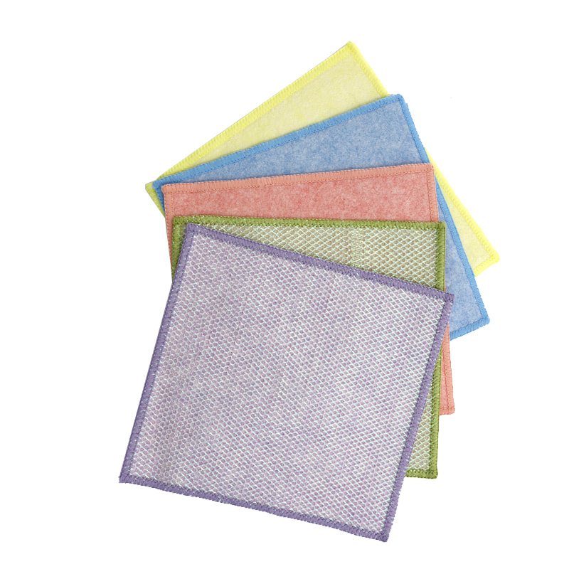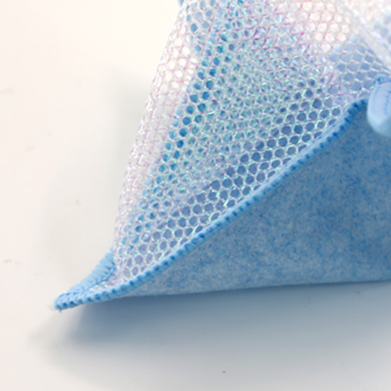 Különleges alakú szerkezet, színes, magas megjelenés; Az egyik oldala erős kaparóképességű színes tisztítókendő, a másik oldala pedig hálós kendő, amely megfelel a kaparás közbeni tisztítás kettős funkciójának; Olajmentes és erős vízfelvevő képességgel rendelkezik.Egyik oldalára különféle mintázatú színes selyem került beültetésre, a másik oldalra pedig nem olajos és vízelnyelő viszkóz szövetfelület, ami gyönyörű, és az egyik oldalon a súrolás és a dörzsölés kettős funkciójának is megfelel.