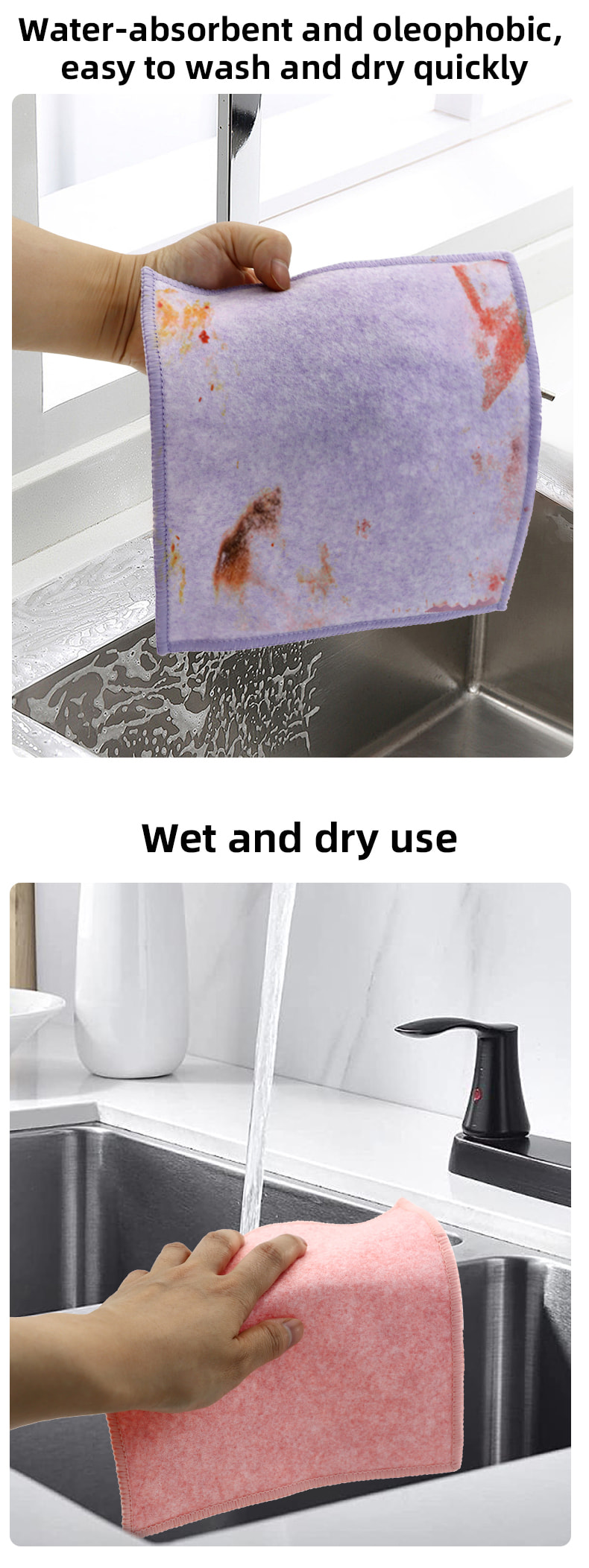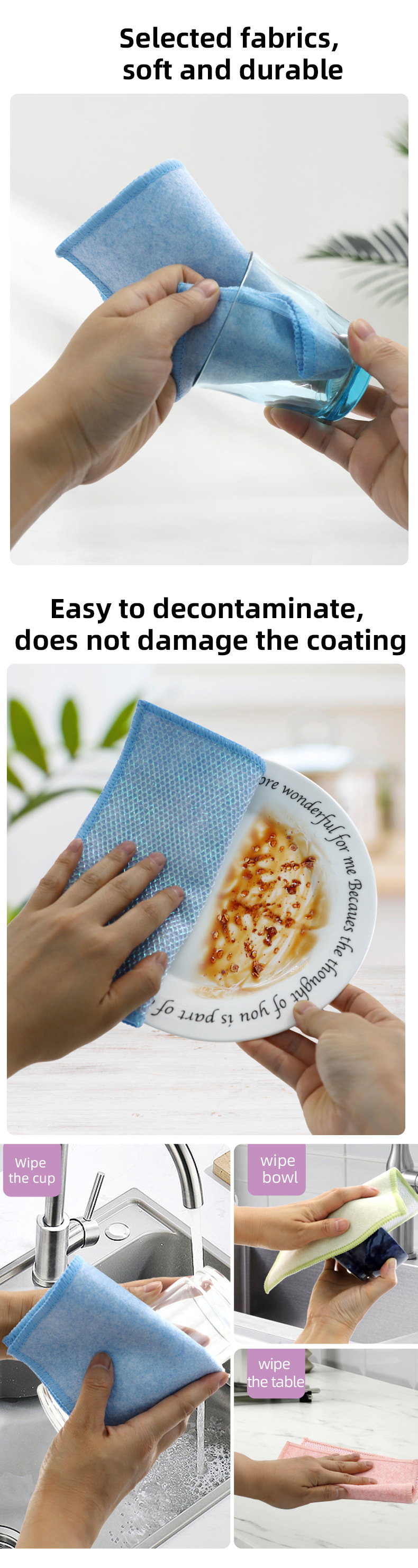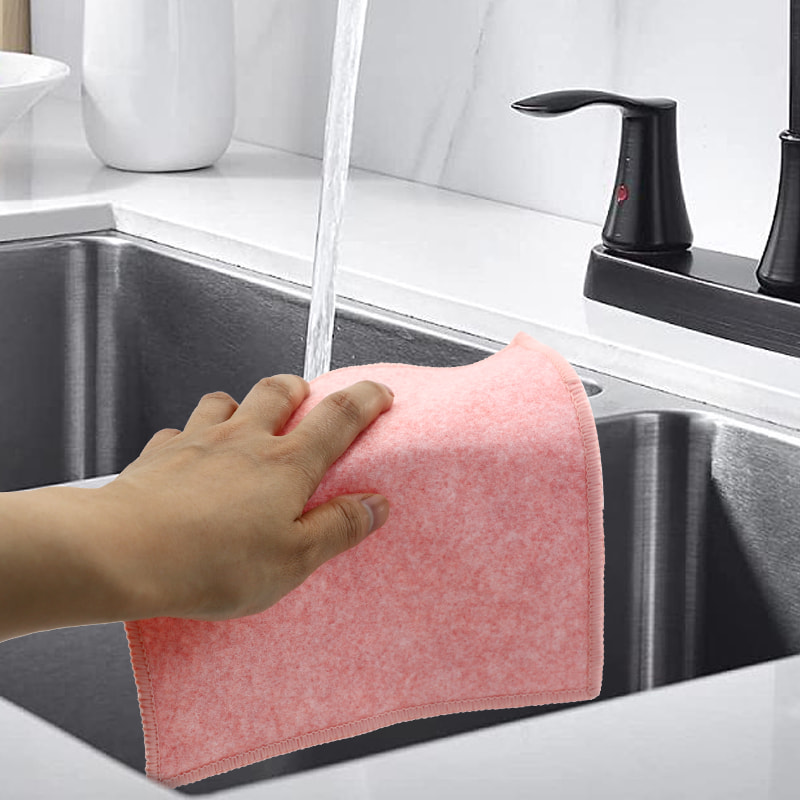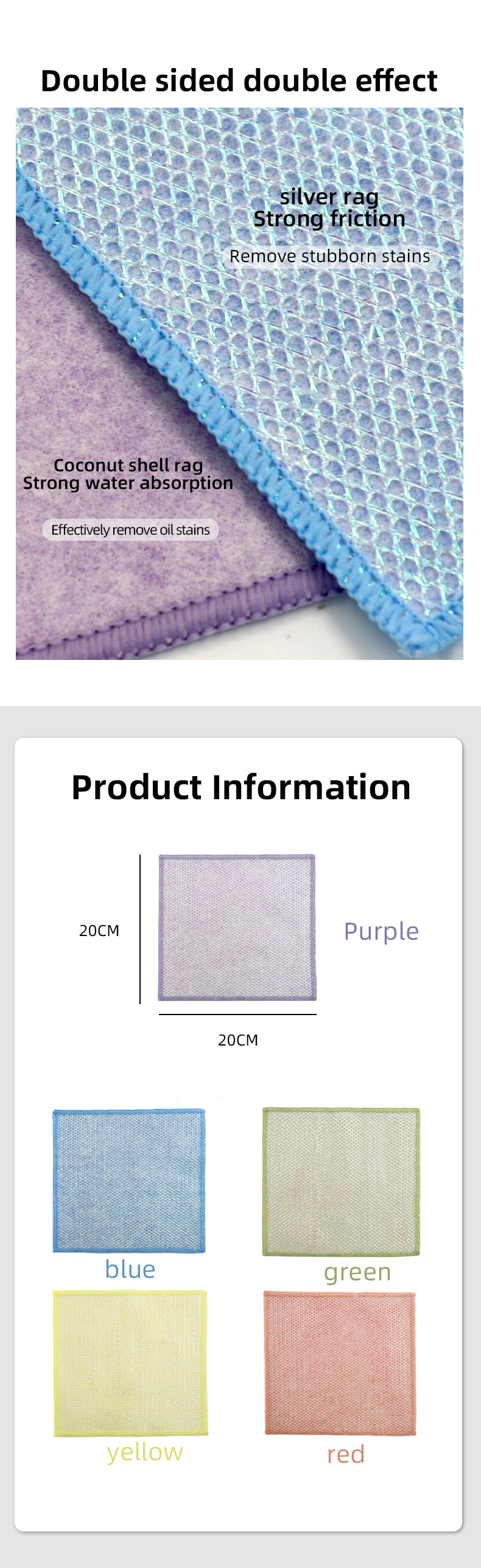 Különleges alakú szerkezet, színes, magas megjelenés; Az egyik oldala erős kaparóképességű színes tisztítókendő, a másik oldala pedig hálós kendő, amely megfelel a kaparás közbeni tisztítás kettős funkciójának; Olajmentes és erős vízfelvevő képességgel rendelkezik.Egyik oldalára különféle mintázatú színes selyem került beültetésre, a másik oldalra pedig nem olajos és vízelnyelő viszkóz szövetfelület, ami gyönyörű, és az egyik oldalon a súrolás és a dörzsölés kettős funkciójának is megfelel.